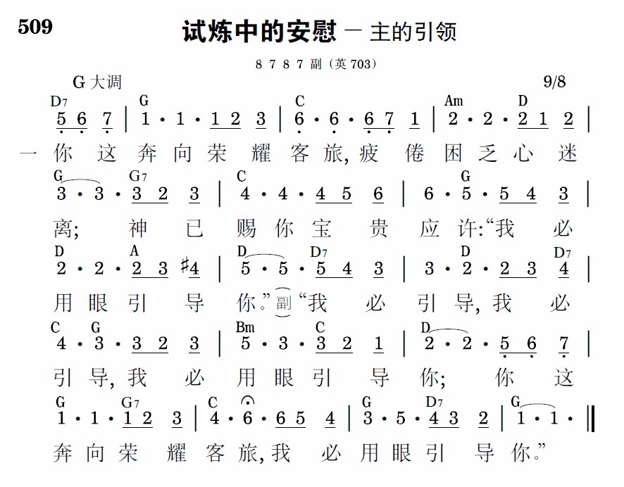 “我必引导,我必引导,我必用眼引导你;你这奔向荣耀客旅,我必用眼引导你。”