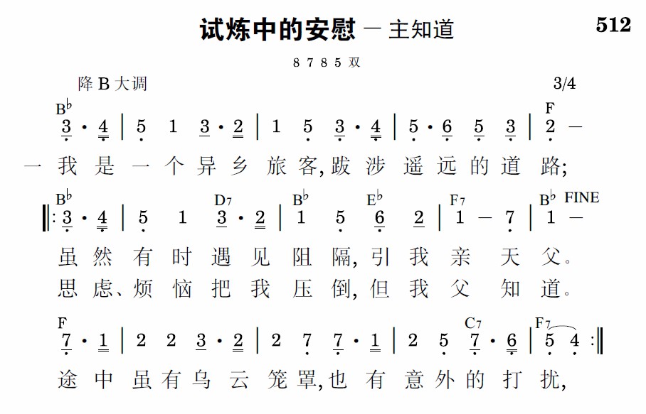 我是一个异乡旅客,跋涉遥远的道路;虽然有时遇见阻隔,引我亲天父。途中虽有乌云笼罩,也有意外的打扰,思虑、烦恼把我压倒,但我父知道。