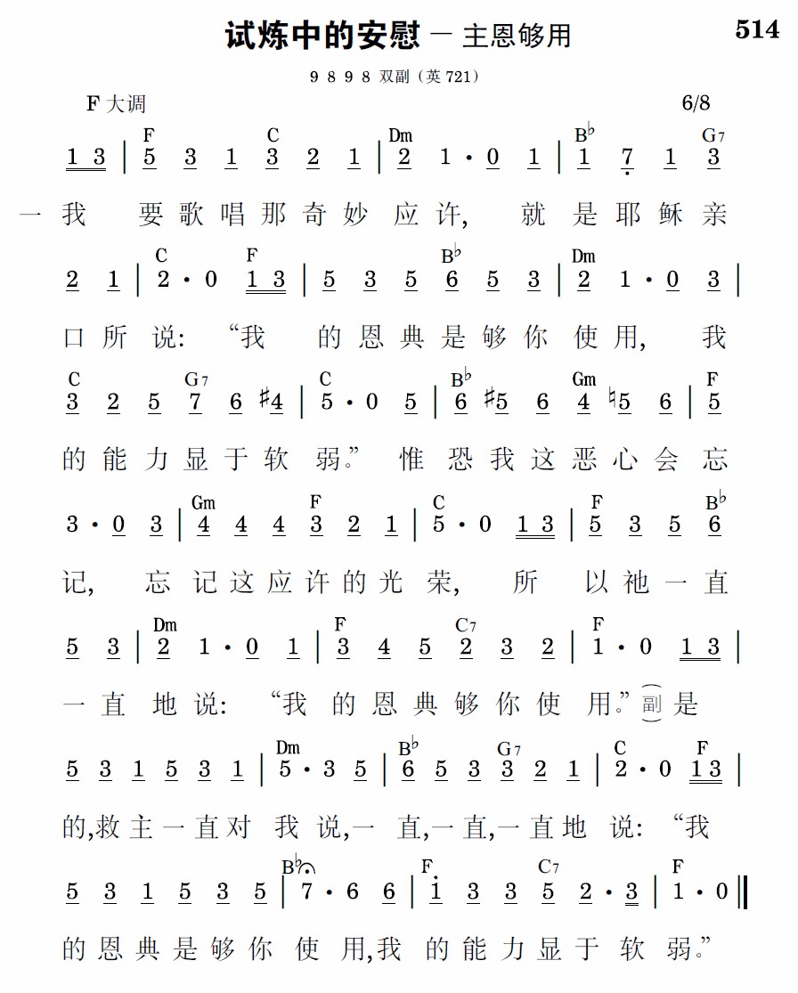 祂的恩典够使我得救,脱离罪恶,得着新心;够使我灵、魂、体都圣洁,并且满有主的圣灵。祂的恩典够助我经过各种试炼,无论多凶;祂的应许抵挡了它们,“我的恩典够你使用。”