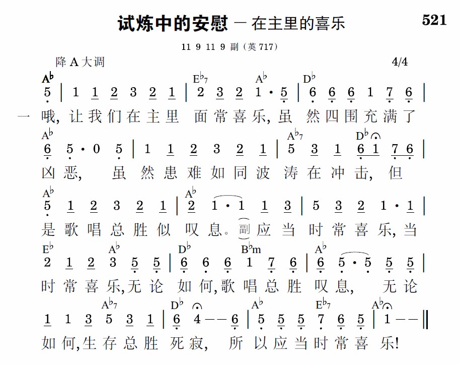 哦,让我们在主里面常喜乐,虽然精神在病中消磨;因主的喜乐就是你的力量,若靠主喜乐就必刚强。