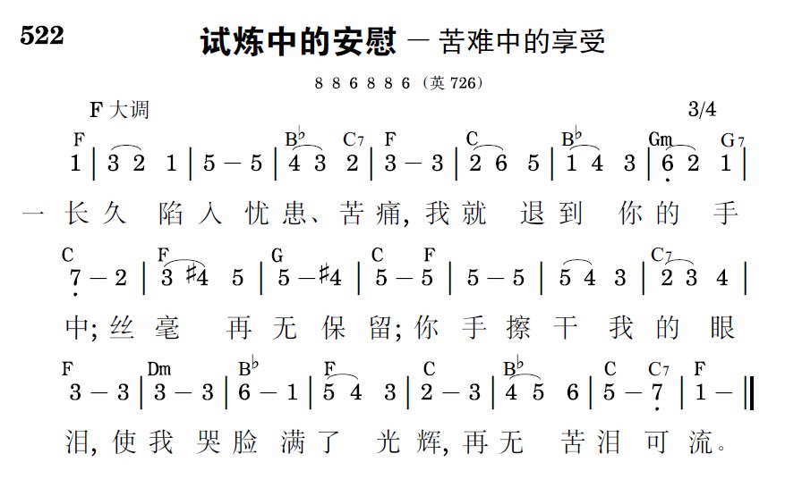 长久陷入忧患、苦痛,我就退到你的手中;丝毫再无保留;你手擦干我的眼泪,使我哭脸满了光辉,再无苦泪可流。