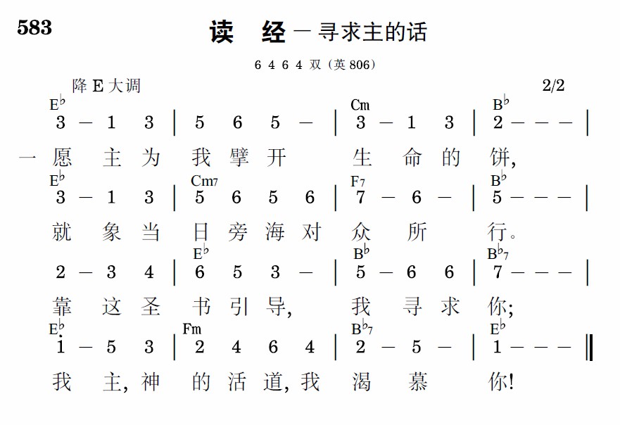 愿主为我擘开生命的饼,就像当日旁海对众所行。靠这圣书引导,我寻求你;我主,神的活道,我渴慕你!