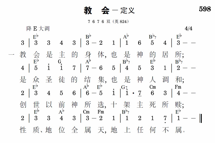 她是新造的新人,基督复活所生;圣灵里面受了浸,借道之洗成圣。基督是她的生命,又是她的元首;她与基督同性情,高升远超万有。