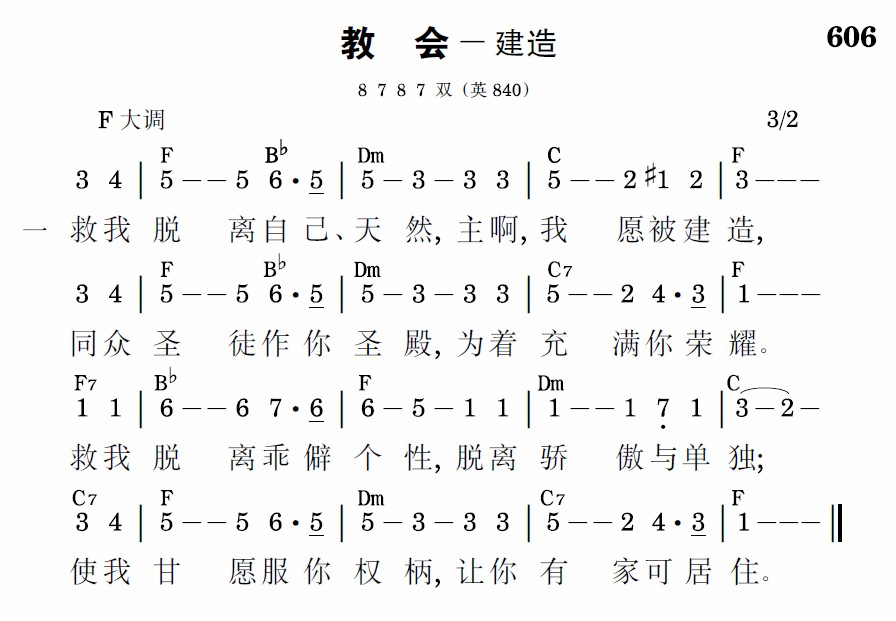 救我脱离自己、天然,主啊,我愿被建造,同众圣徒作你圣殿,为着充满你荣耀。救我脱离乖僻个性,脱离骄傲与单独;使我甘愿服你权柄,让你有家可居住。