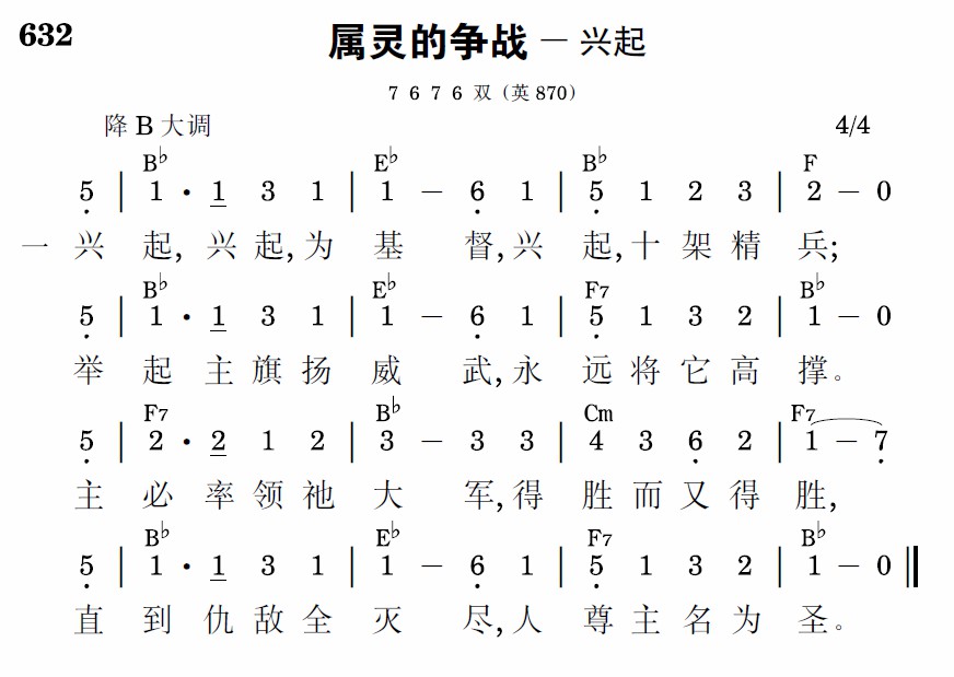 兴起,兴起,为基督,兴起,听主号令;走上疆场齐步武,靠主得胜大名。仇敌虽多,又凶险,也必向其进攻;越险,越攻,越勇敢,攻到仇敌消踪。