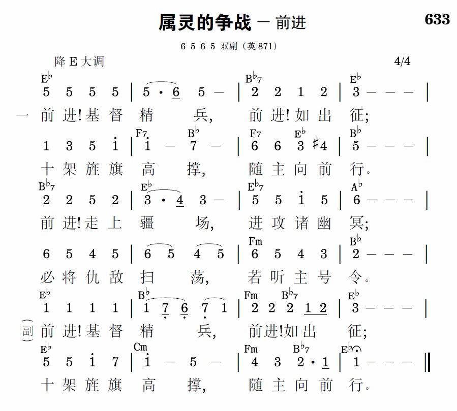 前进!基督精兵,前进!如出征;十架旌旗高撑,随主向前行。前进!走上疆场,进攻诸幽冥;必将仇敌扫荡,若听主号令。