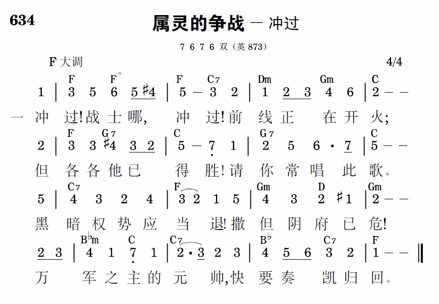 冲过!战士哪,冲过!前线正在开火;但各各他已得胜,请你常唱此歌。黑暗权势应当退,撒但阴府已危!万军之主的元帅,快要奏凯归回。