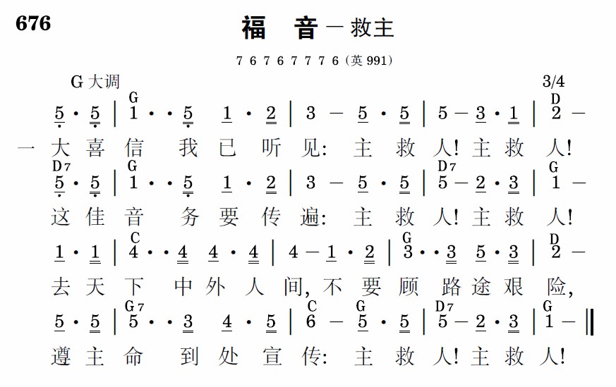 大喜信我已听见:主救人!主救人!这佳音务要传遍:主救人!主救人!去天下中外人间,不要顾路途艰险,遵主命到处宣传:主救人!主救人!
