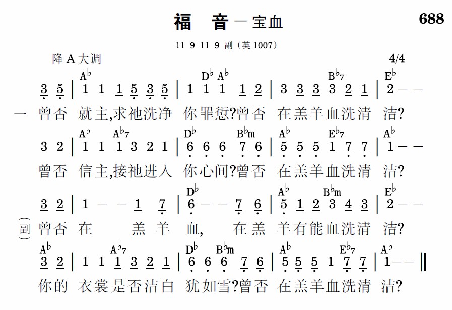 曾否就主,求祂洗净你罪愆?曾否在羔羊血洗清洁?曾否信主,接祂进入你心间?曾否在羔羊血洗清洁?