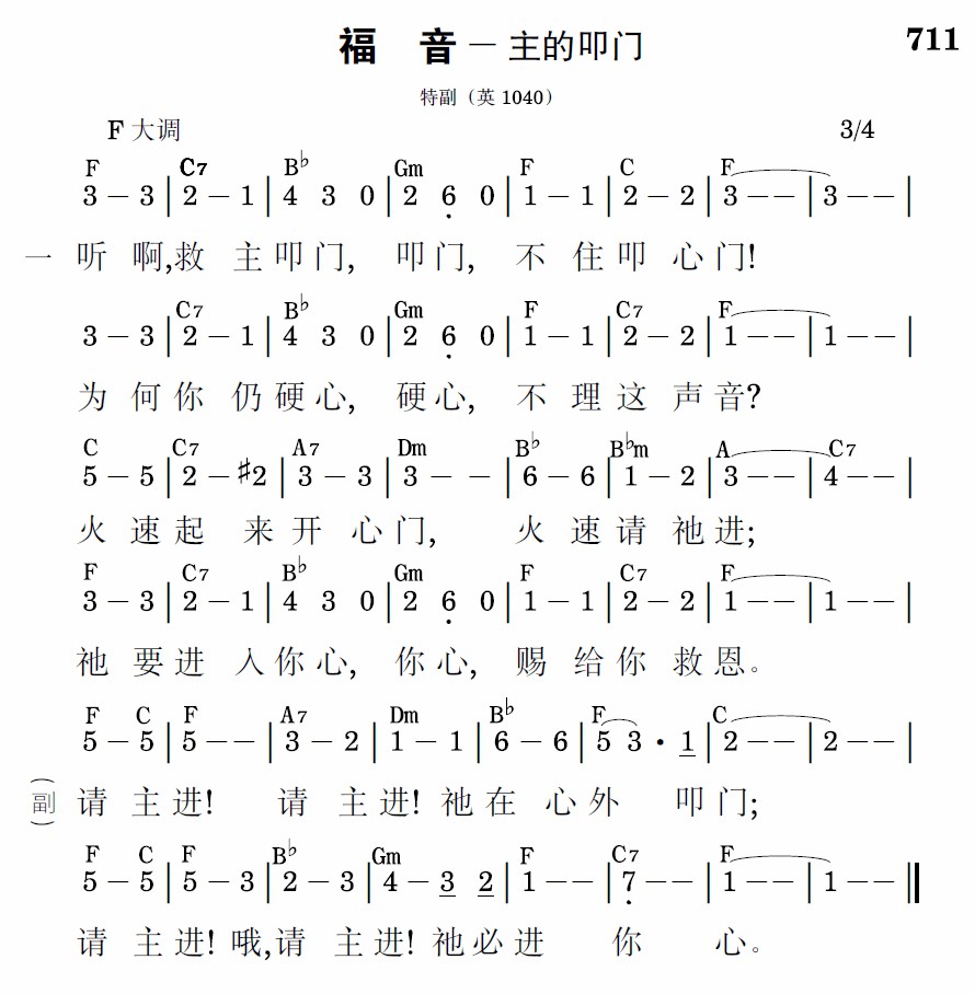 听啊,救主叩门,叩门,不住叩心门!为何你仍硬心,硬心,不理这声音?火速起来开心门,火速请祂进;祂要进入你心,你心,赐给你救恩。