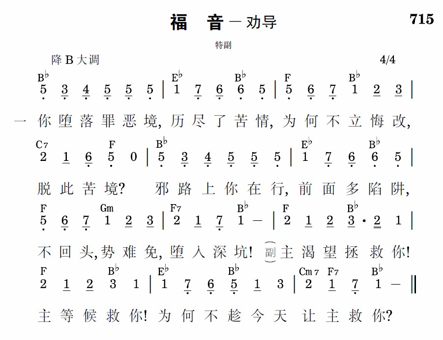 你堕落罪恶境,历尽了苦情,为何不立悔改,脱此苦境?邪路上你在行,前面多陷阱,不回头,势难免,堕入深坑!