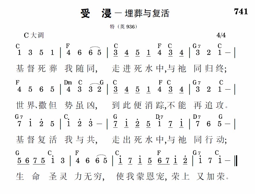 基督死葬我随同,走进死水中,与祂同归终;世界、撒但势虽凶,到此便消踪,不能再追攻。基督复活我与共,走出死水中,与祂同行动;生命圣灵力无穷,使我蒙恩宠,荣上又加荣。