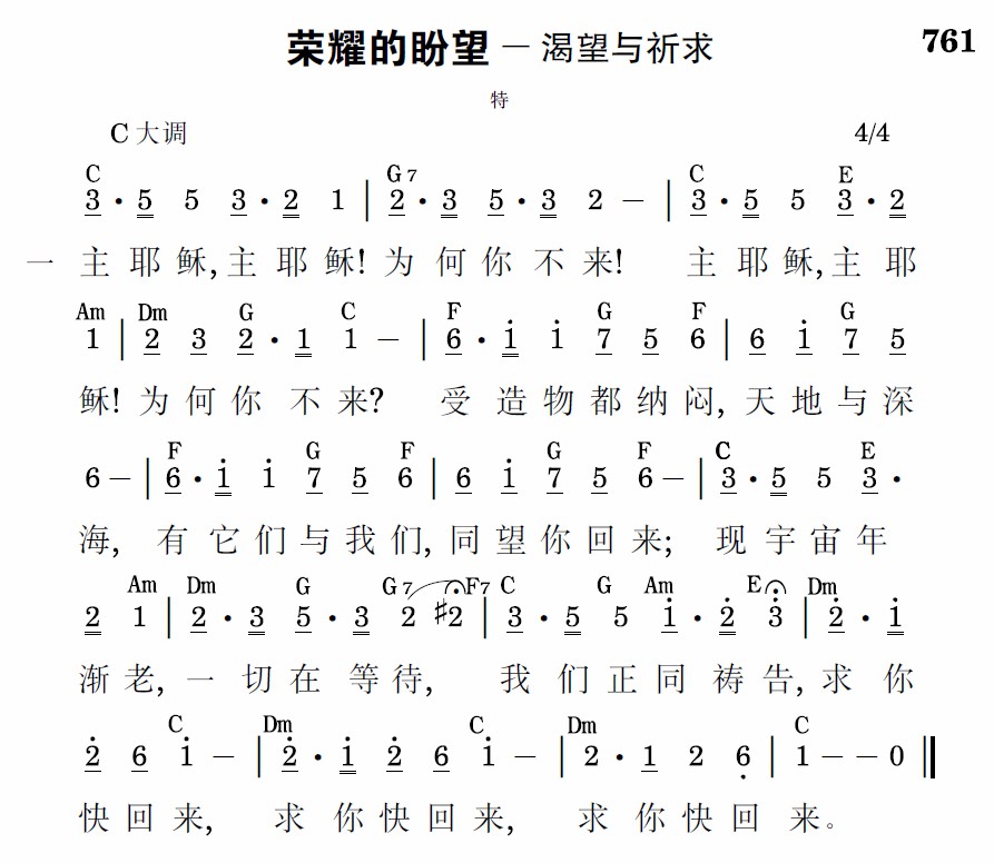 主耶稣,主耶稣!为何你不来?主耶稣,主耶稣!为何你不来?你是要我等候到何日何年?我祷告,我看守,已难再迟延;主耶稣,主耶稣!我求你快来,主耶稣,主耶稣!我求你快来!