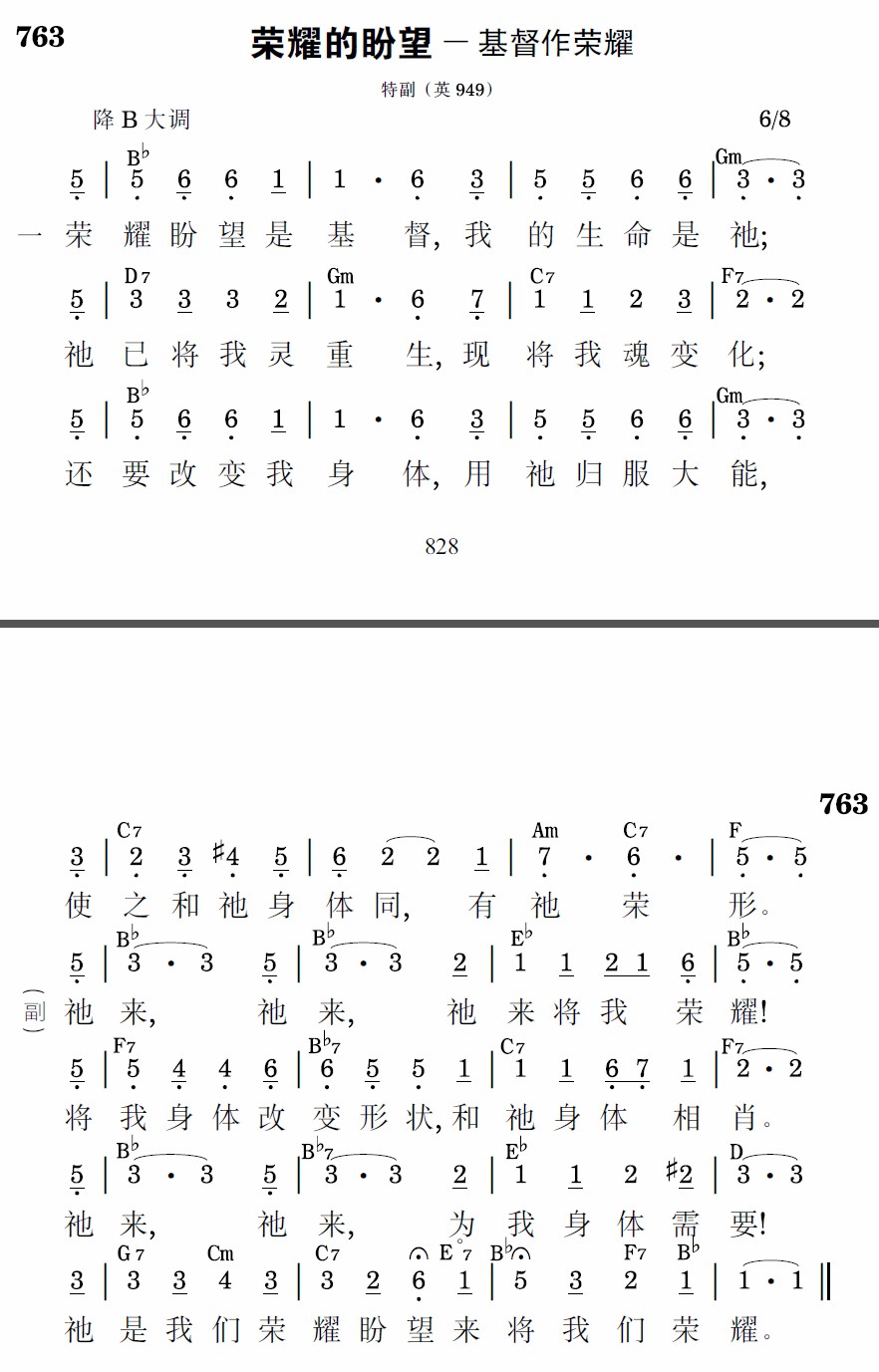 荣耀盼望是基督,我的生命是祂;祂已将我灵重生,现将我魂变化;还要改变我身体,用祂归服大能,使之和祂身体同,有祂荣形。