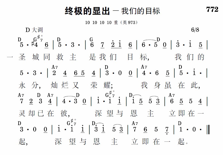 圣城同救主是我们目标,我们的永分,灿烂又荣耀;我身虽在此,灵却已在彼,深望与恩主立在一起,深望与恩主立在一起。