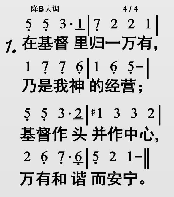 在基督里归一万有,乃是我神的经营;基督作头并作中心,万有和谐而安宁。