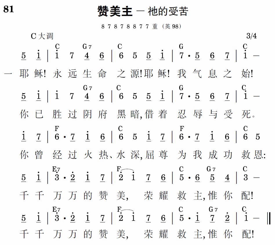 人所堆在你身羞辱,你全无声的忍受;甚至忍受死的痛苦,为使救赎得成就。你的降卑令人惊奇,竟肯来到受死之地:千千万万的赞美,宝贵救主,唯你配!