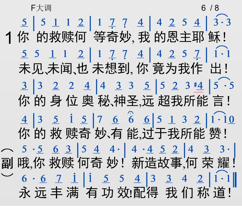 哦,你救赎何奇妙!新造故事,何荣耀!永远丰满有功效!配得我们称道!