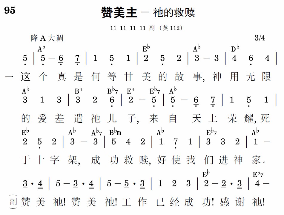赞美祂!赞美祂!工作已经成功!感谢祂!感谢祂!恩典真宽宏!我们荣耀耶稣,我们的救主,我们歌唱耶稣,永远不止住。