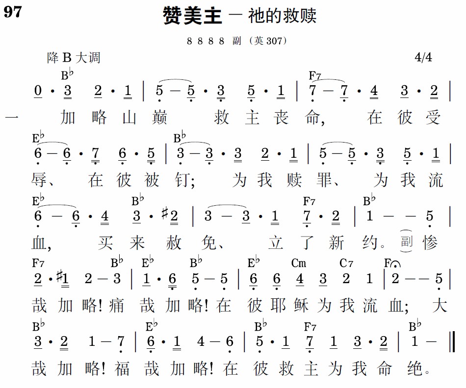 加略山巅救主丧命,在彼受辱、在彼被钉;为我赎罪、为我流血,买来赦免、立了新约。