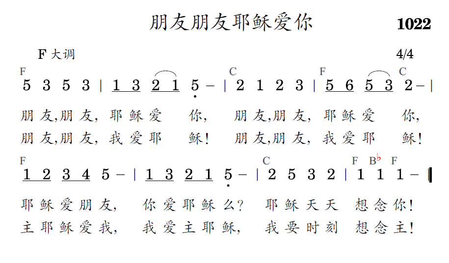 朋友,朋友,耶稣爱你,朋友,朋友,耶稣爱你,耶稣爱朋友,你爱耶稣么?耶稣天天想念你!