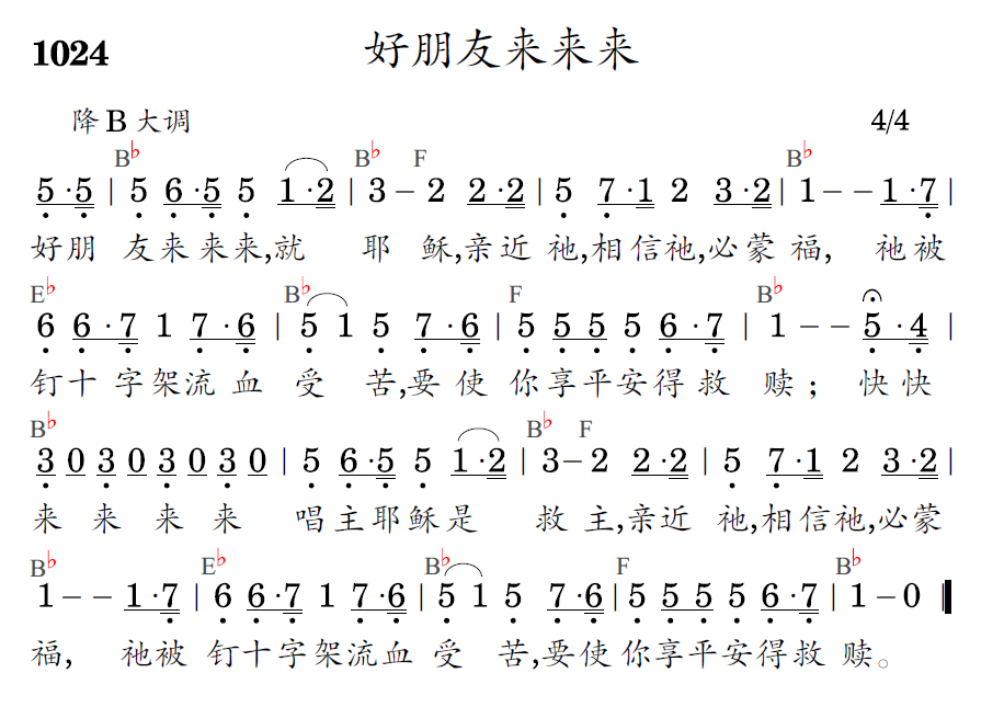 好朋友来来来,就耶稣,亲近祂,相信祂,必蒙福,祂被钉十字架流血受苦,要使你享平安得救赎;快快来来来来唱主耶稣是救主,亲近祂,相信祂,必蒙福,祂被钉十字架流血受苦,要使你享平安得救赎。