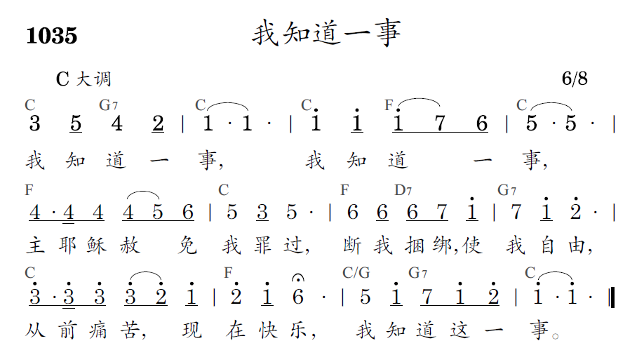 我知道一事,我知道一事,主耶稣赦免我罪过,断我捆绑,使我自由,从前痛苦,现在快乐,我知道这一事。