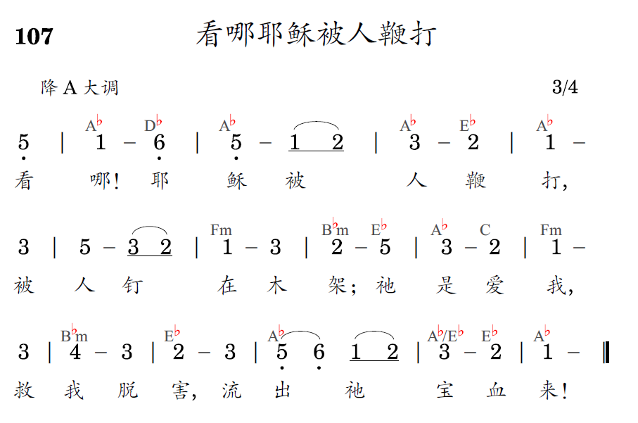 看哪!耶稣被人鞭打,被人钉在木架;祂是爱我,救我脱害,流出祂宝血来!