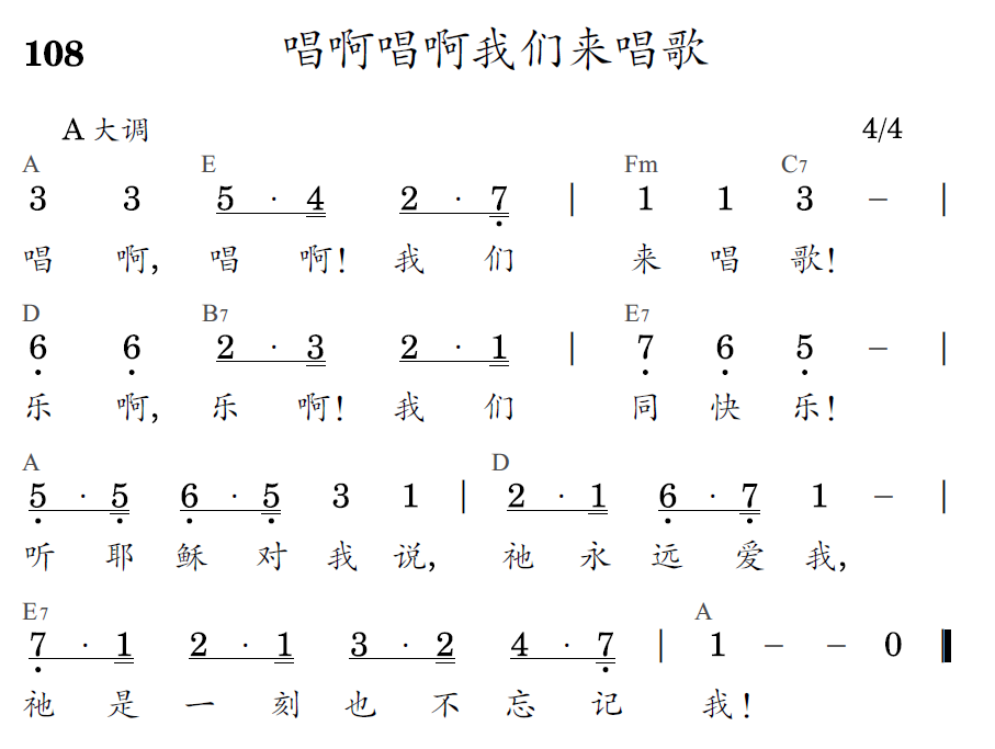 唱阿,唱阿!我们来唱歌!乐阿,乐阿!我们同快乐!听耶稣对我说,祂永远爱我,祂是一刻也不忘记我!