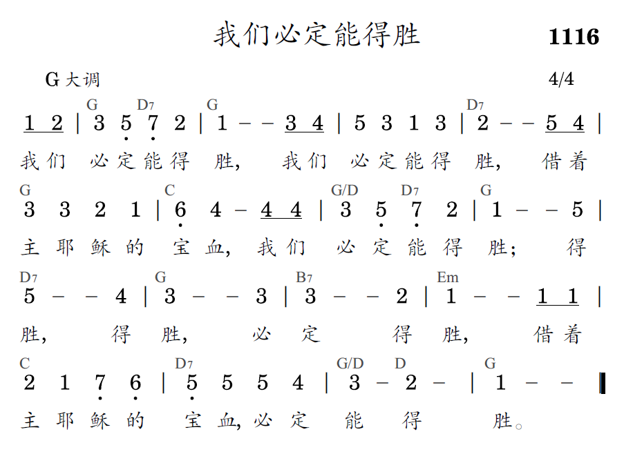 我们必定能得胜,我们必定能得胜,藉着主耶稣的宝血,我们必定能得胜;得胜,得胜,必定得胜,藉着主耶稣的宝血,必定能得胜。