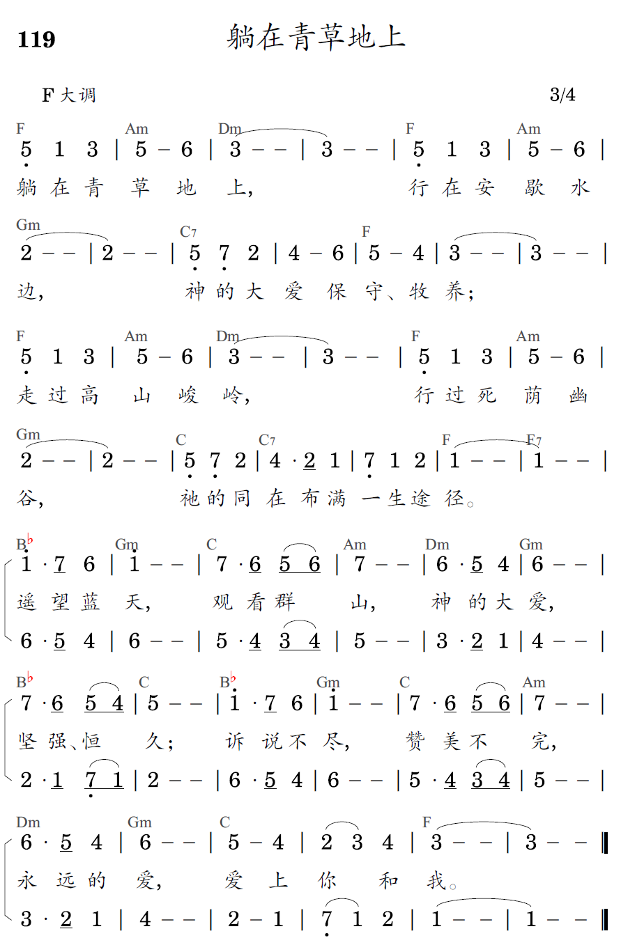 躺在青草地上,行在安歇水边,神的大爱保守、牧养;走过高山峻岭,行过死荫幽谷,祂的同在布满一生途径。遥望蓝天,观看群山,神的大爱,坚强、恒久;诉说不尽,赞美不完,永远的爱,爱上你和我。