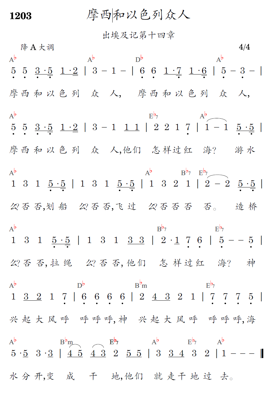 摩西和以色列众人,摩西和以色列众人,摩西和以色列众人,他们怎样过红海?游水么?否否,划船么?否否,飞过么?否否否否。造桥么?否否,拉绳么?否否,他们怎样过红海?神兴起大风呼呼呼呼,神兴起大风呼呼呼呼,海水分开,变成干地,他们就走干地过去。