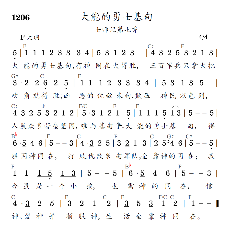 大能的勇士基甸,有神同在大得胜,三百军兵只拿火把吹角就得胜;凶恶的仇敌米甸,欺压神民以色列,人数众多营垒坚固,难与基甸争。大能的勇士基甸,得胜因神同在,打败仇敌米甸军队,全靠神的同在;我今虽是一个小孩,也需神的同在,信神、爱神并顺服神,生活全靠神同在。