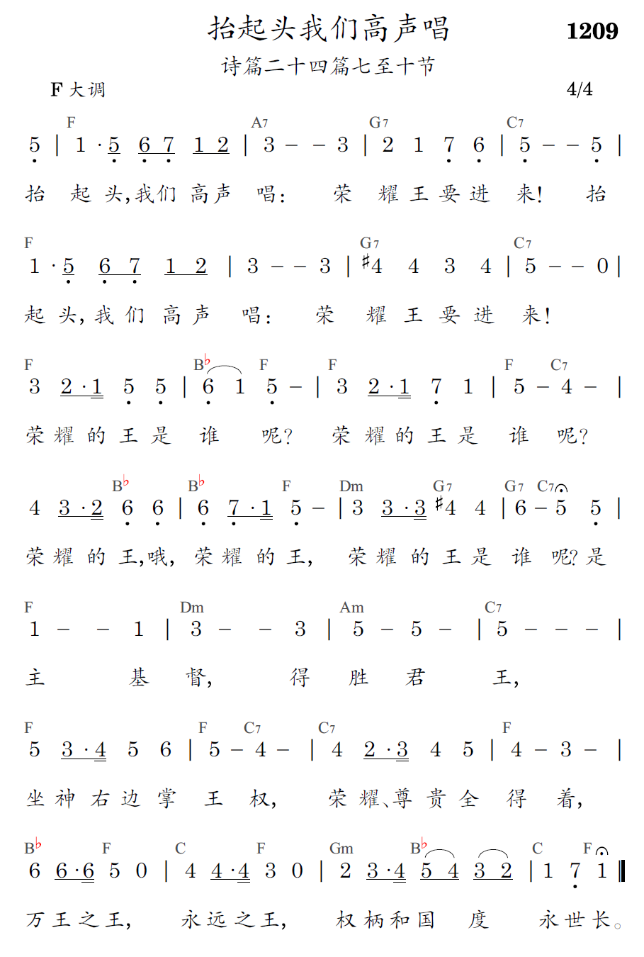 抬起头,我们高声唱:荣耀王要进来!抬起头,我们高声唱:荣耀王要进来!荣耀的王是谁呢?荣耀的王是谁呢?荣耀的王,哦,荣耀的王,荣耀的王是谁呢?是主基督,得胜君王,坐神右边掌王权,荣耀、尊贵全得着,万王之王,永远之王,权柄和国度永世长。