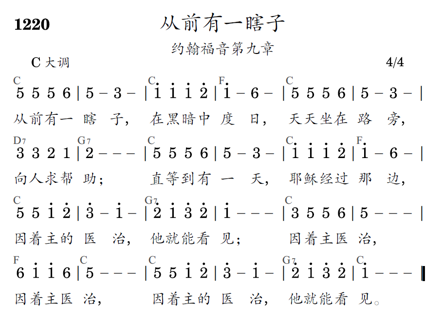从前有一瞎子,在黑暗中度日,天天坐在路旁,向人求帮助;直等到有一天,耶稣经过那边,因着主的医治,他就能看见;因着主医治,因着主医治,因着主的医治,他就能看见。