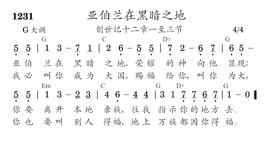 亚伯兰在黑暗之地,荣耀的神向他显现:你要离开本地亲族,往我指示你的地方去。我必叫你成为大国,赐福给你,叫你为大,你也要叫别人得福,地上万族都因你得福。