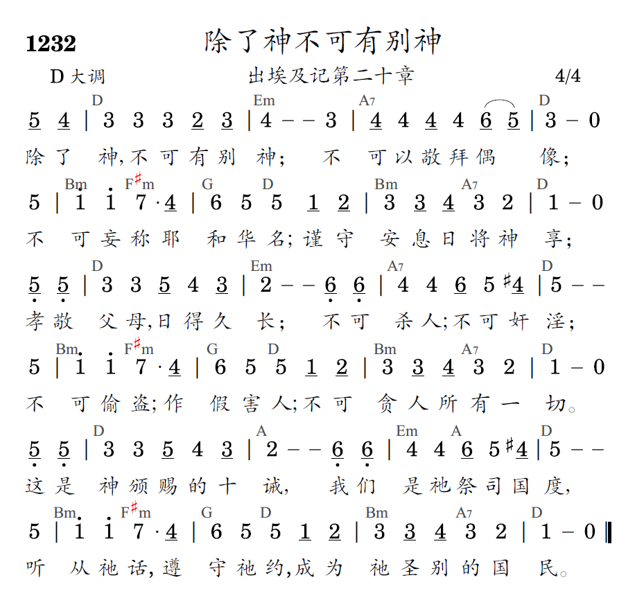 除了神,不可有别神;不可以敬拜偶像;不可妄称耶和华名;谨守安息日将神享;孝敬父母,日得久长;不可杀人;不可奸淫;不可偷盗;作假害人;不可够人所有一切。这是神颁赐的十诫,我们是祂祭司国度,听从祂话,遵守祂约,成为祂圣别的国民。