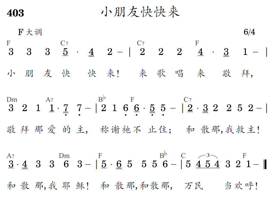 小朋友快快来!来歌唱来敬拜,敬拜那爱的主,称谢祂不止住;和散那,我救主!和散那,我耶稣!和散那,和散那,万民当欢呼!