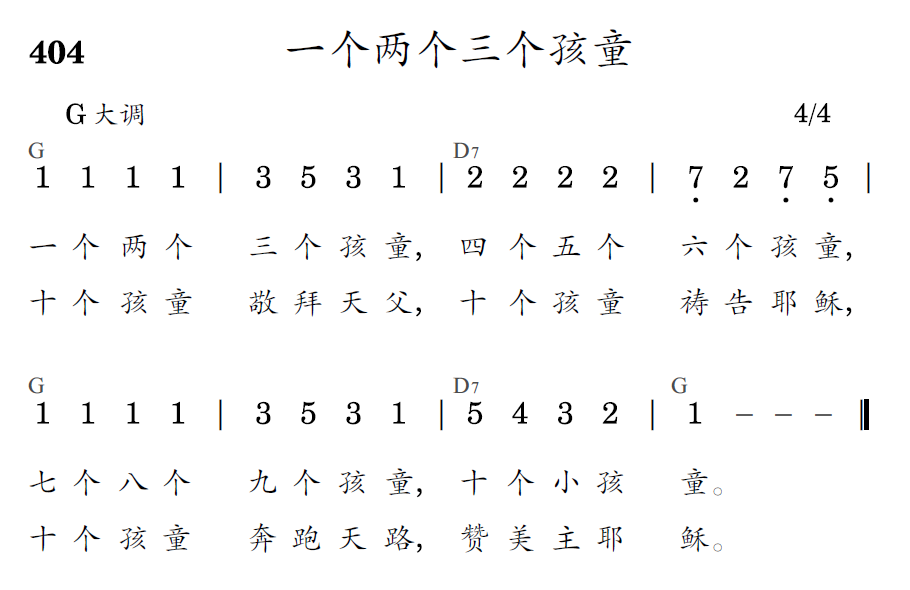 一个两个三个孩童,四个五个六个孩童,七个八个九个孩童,十个小孩童。十个孩童敬拜天父,十个孩童祷告耶稣,十个孩童奔跑天路,赞美主耶稣。