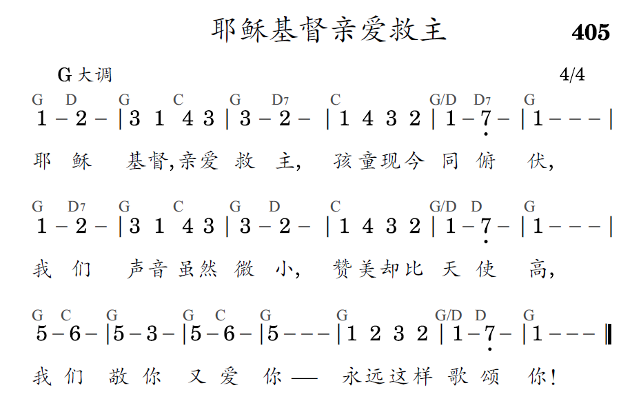 耶稣基督,亲爱救主,孩童现今同俯伏,我们声音虽然微小,赞美却比天使高,我们敬你又爱你─永远这样歌颂你!