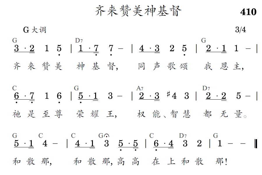 齐来赞美神基督,同声歌颂我恩主,祂是至尊荣耀王,权能、智慧都无量。和散那,和散那,高高在上和散那!