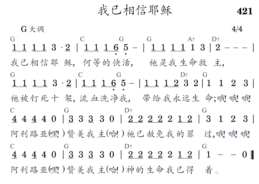 我已相信耶稣,何等的快活,祂是我生命救主,祂被钉死十架,流血洗净我,带给我永远生命;噢!噢!噢!阿利路亚(嘿!)赞美我主(哈!)祂已赦免我的罪过,噢!噢!噢!阿利路亚(嘿!)赞美我主(哈!)神的生命我已得着。