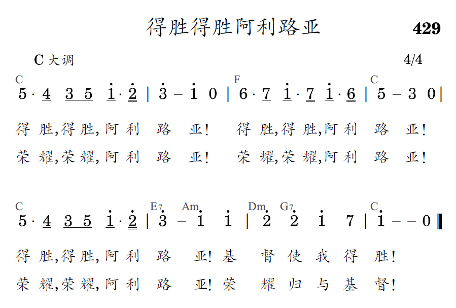 得胜,得胜,阿利路亚!得胜,得胜,阿利路亚!得胜,得胜,阿利路亚!基督使我得胜!荣耀,荣耀,阿利路亚!荣耀,荣耀,阿利路亚!荣耀,荣耀,阿利路亚!荣耀归与基督!