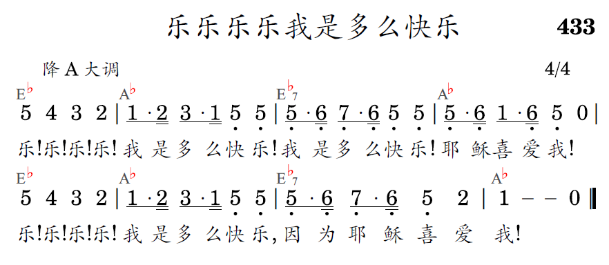 乐!乐!乐!乐!我是多么快乐!我是多么快乐!耶稣喜爱我!乐!乐!乐!乐!我是多么快乐,因为耶稣喜爱我!