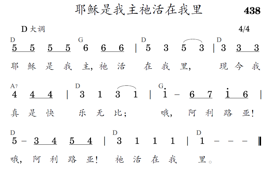 耶稣是我主,祂活在我里,现今我真是快乐无比;哦,阿利路亚!哦,阿利路亚!祂活在我里。