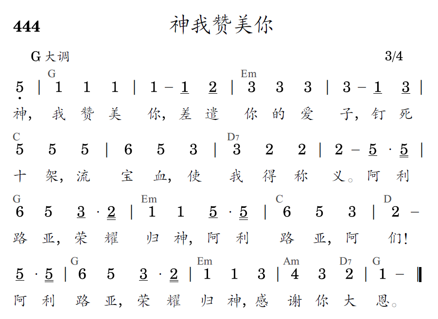神,我赞美你,差遣你的爱子,钉死十架,流宝血,使我得称义。阿利路亚,荣耀归神,阿利路亚,阿们!阿利路亚,荣耀归神,感谢你大恩。