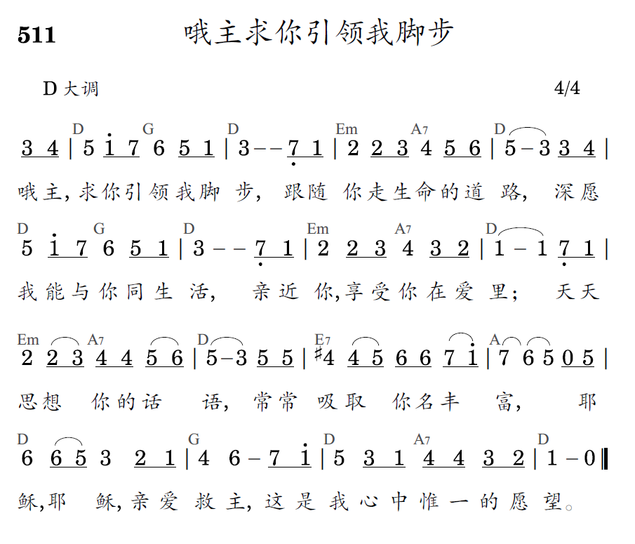 哦主,求你引领我脚步,跟随你走生命的道路,深愿我能与你同生活,亲近你,享受你在爱里;天天思想你的话语,常常吸取你名丰富,耶稣,耶稣,亲爱救主,这是我心中唯一的愿望。
