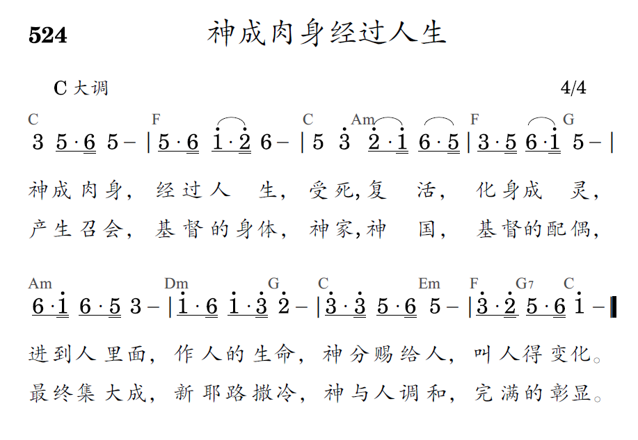 神成肉身,经过人生,受死,复活,化身成灵,进到人里面,作人的生命,神分赐给人,叫人得变化。产生召会,基督的身体,神家,神国,基督的配偶,最终集大成,新耶路撒冷,神与人调和,完满的彰显。