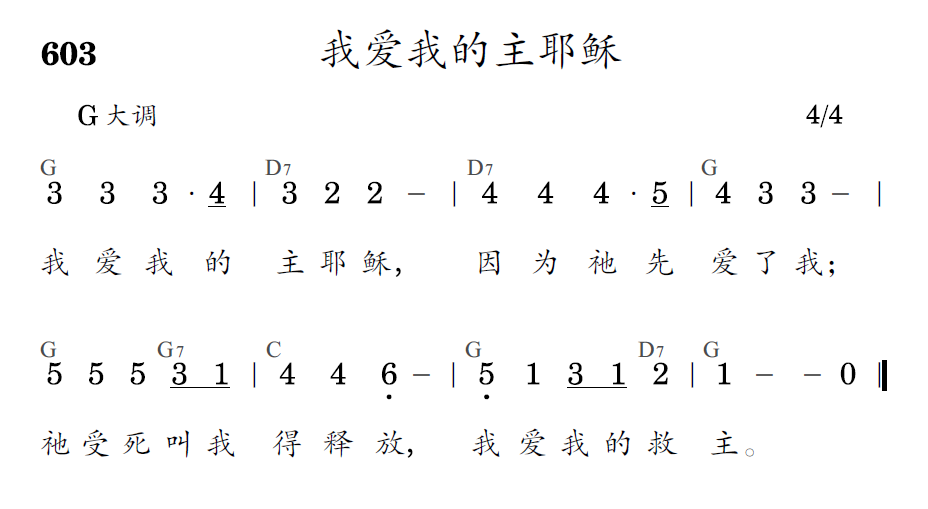 我爱我的主耶稣,因为祂先爱了我;祂受死叫我得释放,我爱我的救主。