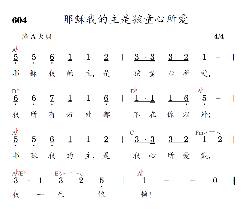 耶稣我的主,是孩童心所爱,我所有好处都不在你以外;耶稣我的主,是我心所爱戴,我一生依赖!